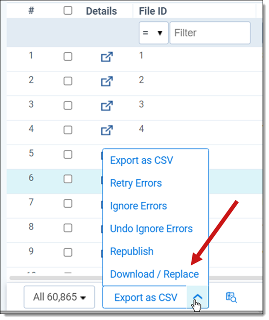 - To take action on a specific file, select it, and then select the Download / Replace mass action.