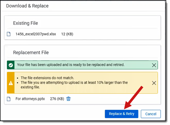 - Once the file is downloaded, resolve the error, and drag the resolved file back into the Download & Replace modal. A message displays that the file is ready for replace and retry. If the file extensions do not match and/or if the new file is larger than the original, you can still proceed with the replace and retry action.