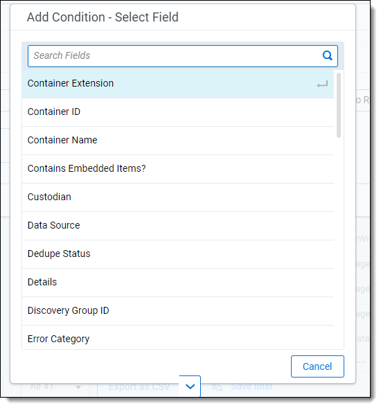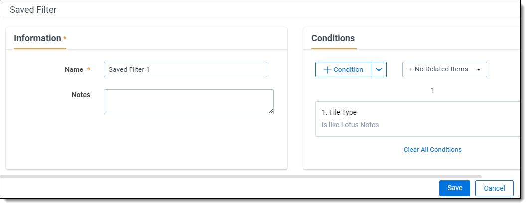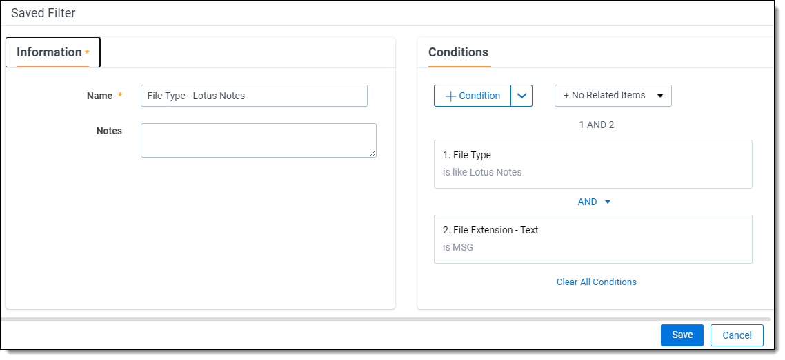 a display of the filter conditions you already set on each field in the view you were previously working in. For example, if you'd just filtered for Lotus Notes files on the File Type field, that filter is displayed. Here, you can start over by clear the conditions you already set, or you can add more conditions by clicking + Conditions. Doing this brings up the Add Condition - Select Field modal, in which you can select additional fields.