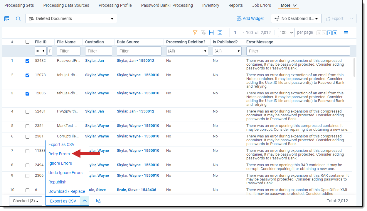 The All Errored Files view contains all the documents that yielded errors in your workspace, including those with a current Error Status value of Resolved and Unresolved. These files are sorted by descending file size starting with the largest containers and ending with the smallest loose files.