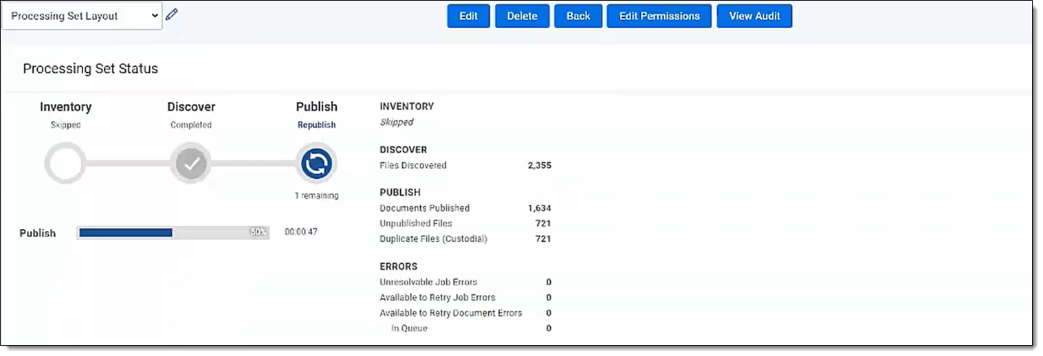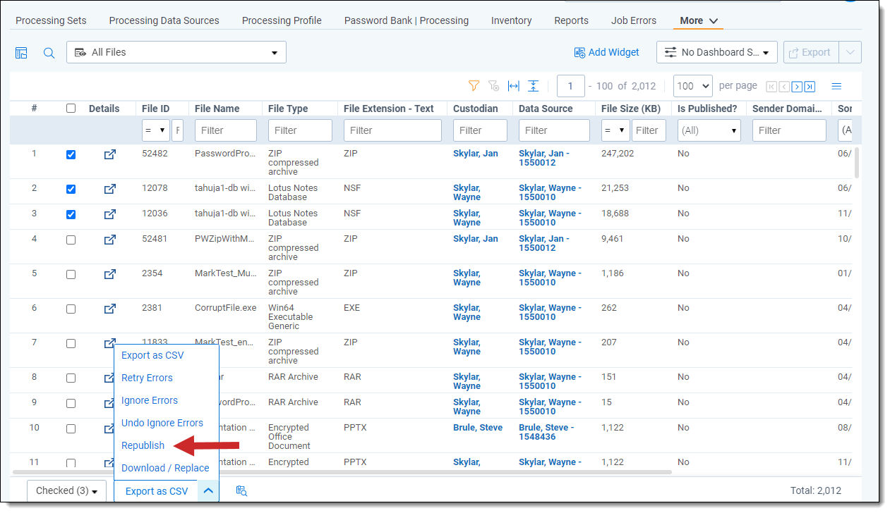 The Republish mass operation provides the ability to publish specific documents on a more granular level compared to the processing set page. For example, you can select specific files and re-publish only that subset. In case only a few members of a family are selected, then this mass operation will automatically republish the whole family of documents.