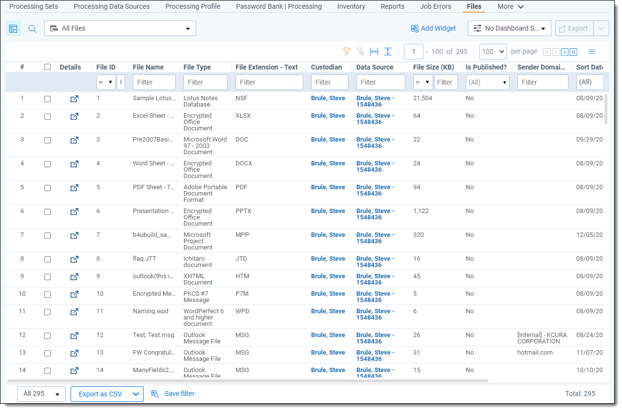 The Files tab in Processing allows you to view and analyze a list of all discovered documents and their metadata before deduplication and publishing.