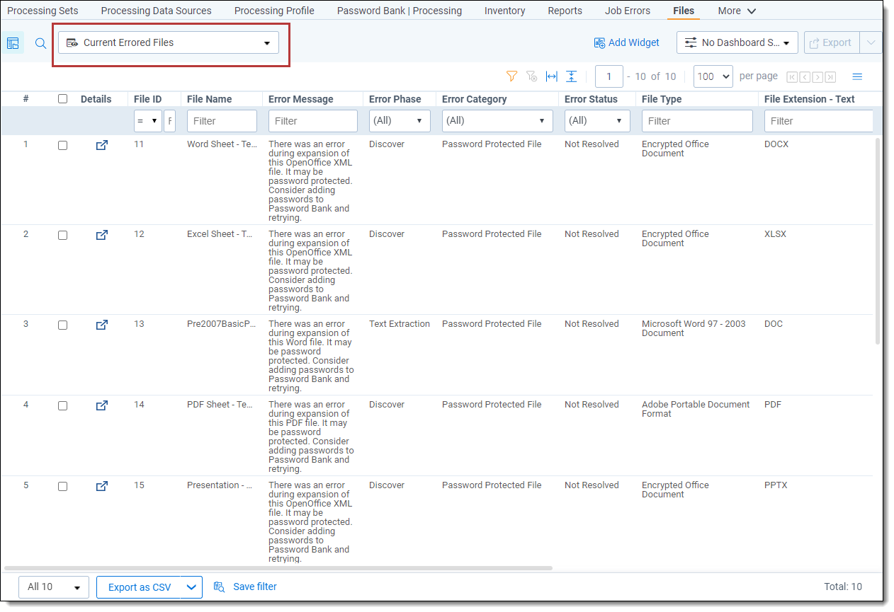 The Current Errored Files view contains all the documents that yielded errors in your workspace that currently have an Error Status value of Not Resolved. By default, this view does not contain files with an Error Status of Resolved, as those can be found in the All Errored Files view.