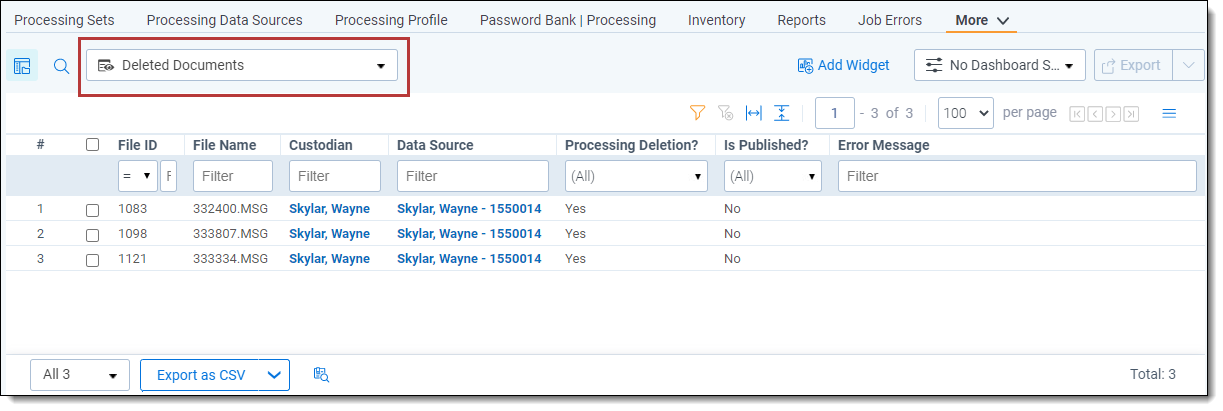 Navigate to the Deleted Documents view to see a record of all deleted documents. The Processing Deletion? field is the yes/no indicator for deleted documents. You can filter by Error Message to see the errors that occurred during deletion. These errors can be retried using the Retry Delete mass operations option. Once deleted, these documents will be excluded from further processing operations (e.g., deduplication, retry, and republish) and the next duplicate will be published as the new master document, if available. To see a summary of master documents that have been replaced, see the Master Document Replacement Summary report in