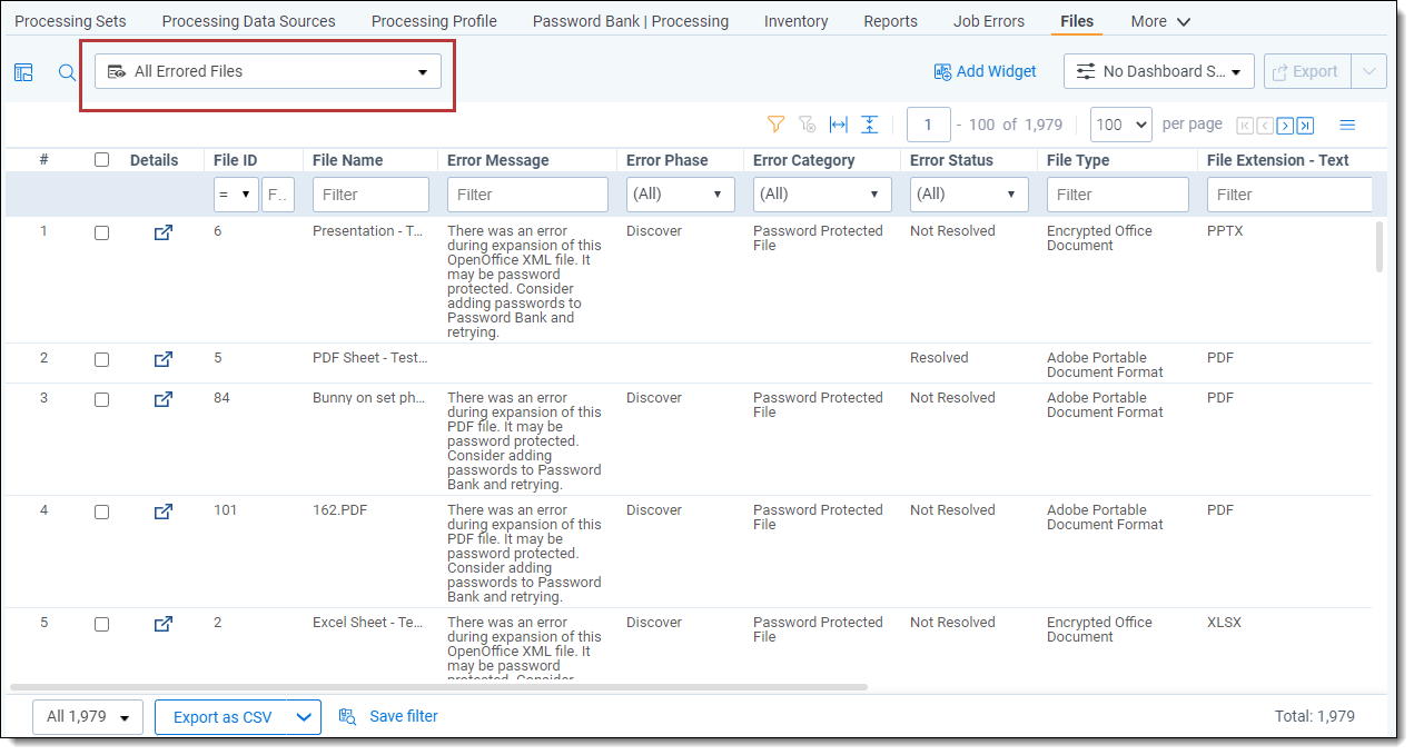 - All Errored Files - contains all the documents that yielded errors in your workspace, including those with a current Error Status value of Resolved and Unresolved.