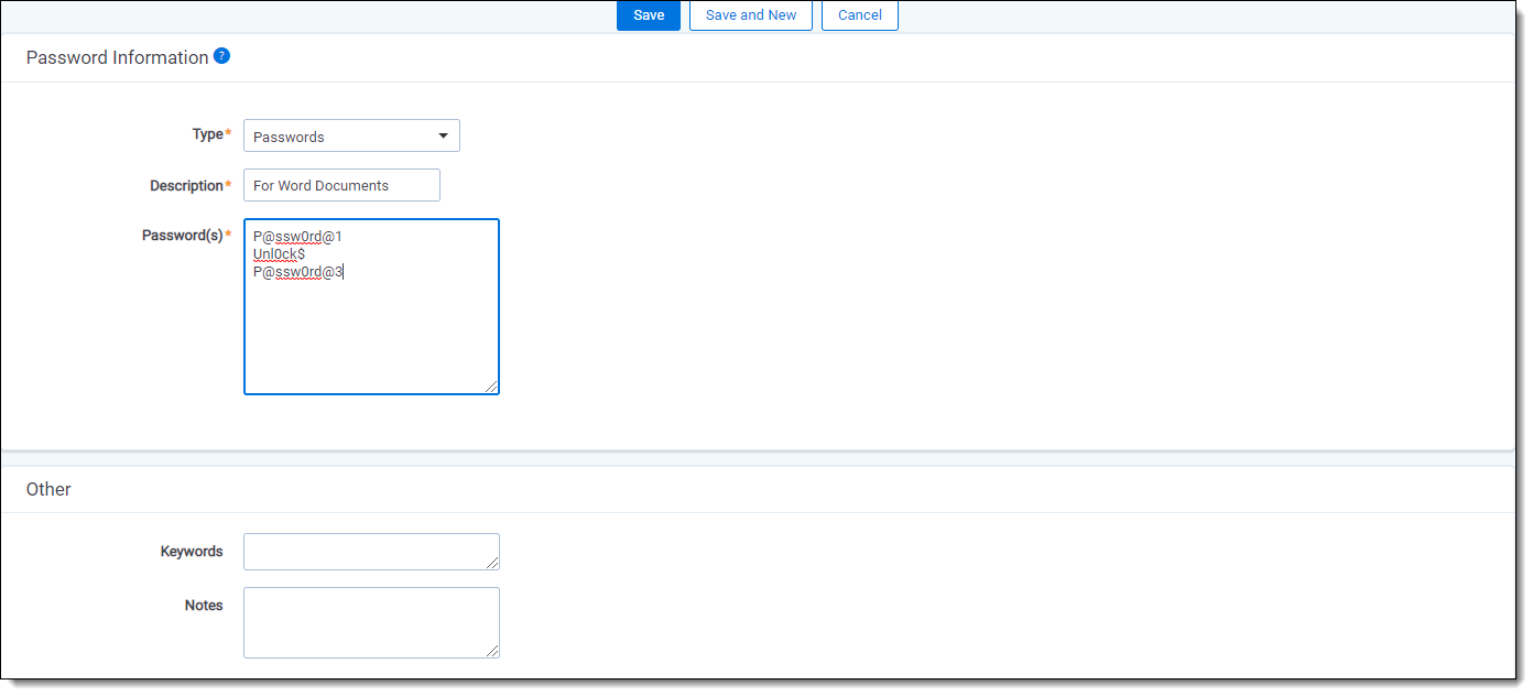 • When you select this type, you must enter at least one password in the Passwords field in order to save.
