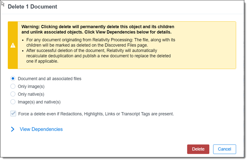 - Click Delete on the warning message. Once you do this, Relativity deletes the selected document from review, and Processing flags it for deletion. When this deletion is complete, the deduplication recalculation will begin.