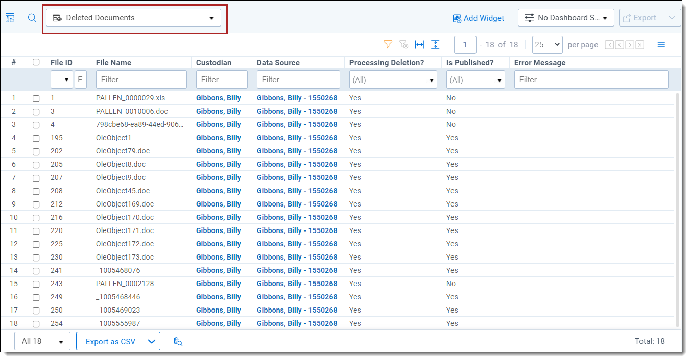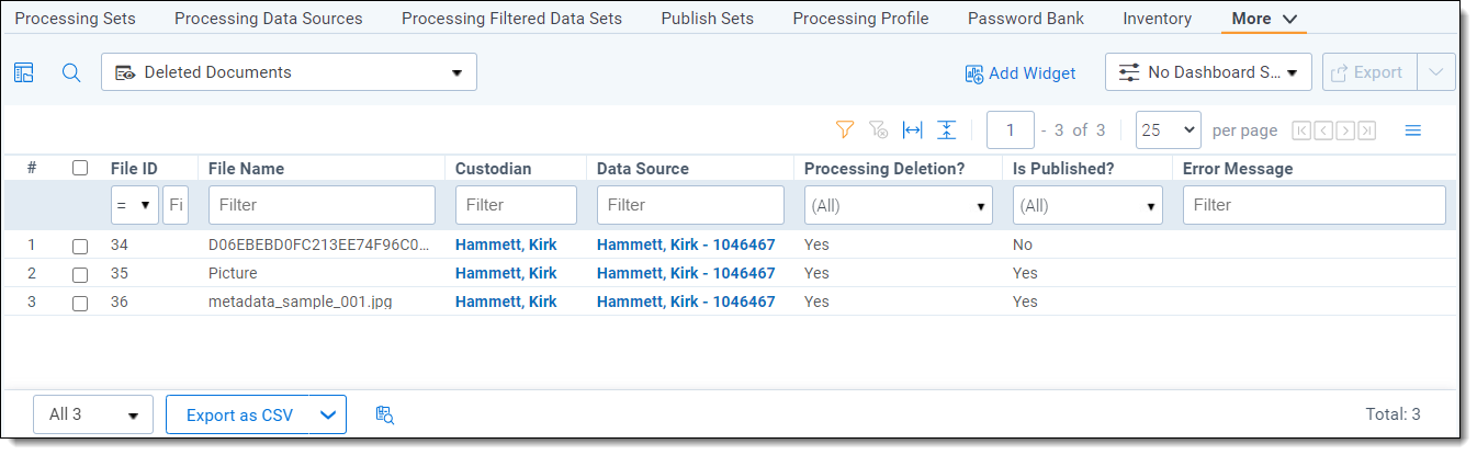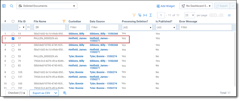 Navigate to the Deleted Documents view to see a record of all deleted documents. The Processing Deletion? field is the yes/no indicator for deleted documents. You can filter by Error Message to see the errors that occurred during deletion. These errors can be retried using the Retry Errors mass operations option. Once deleted, these documents will be excluded from further processing operations (e.g., deduplication, retry, and republish) and the next duplicate will be published as the new master document, if available.