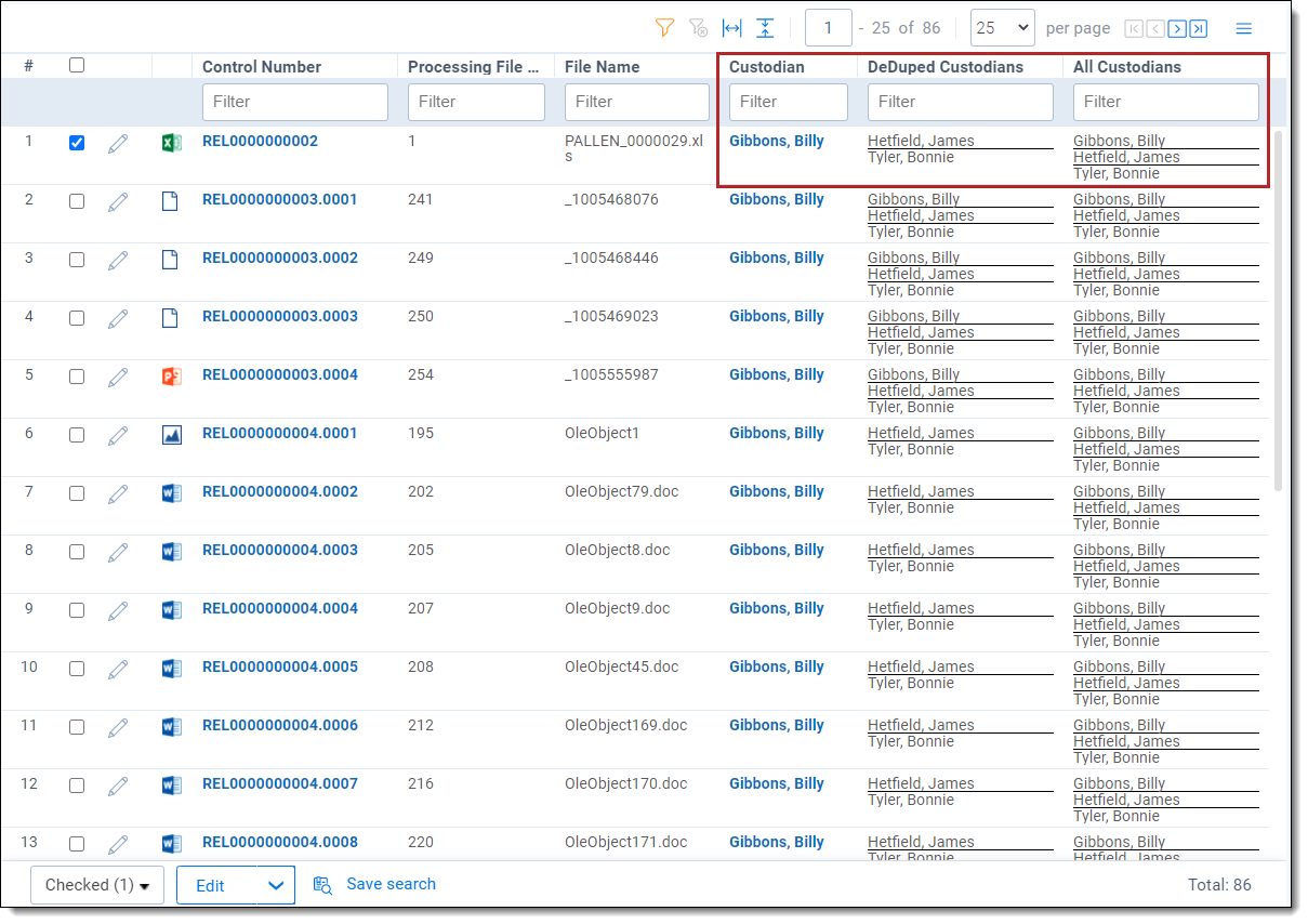In this example, a user has deleted a primary custodian's document, and Processing automatically publishes the next deduped custodian's document.