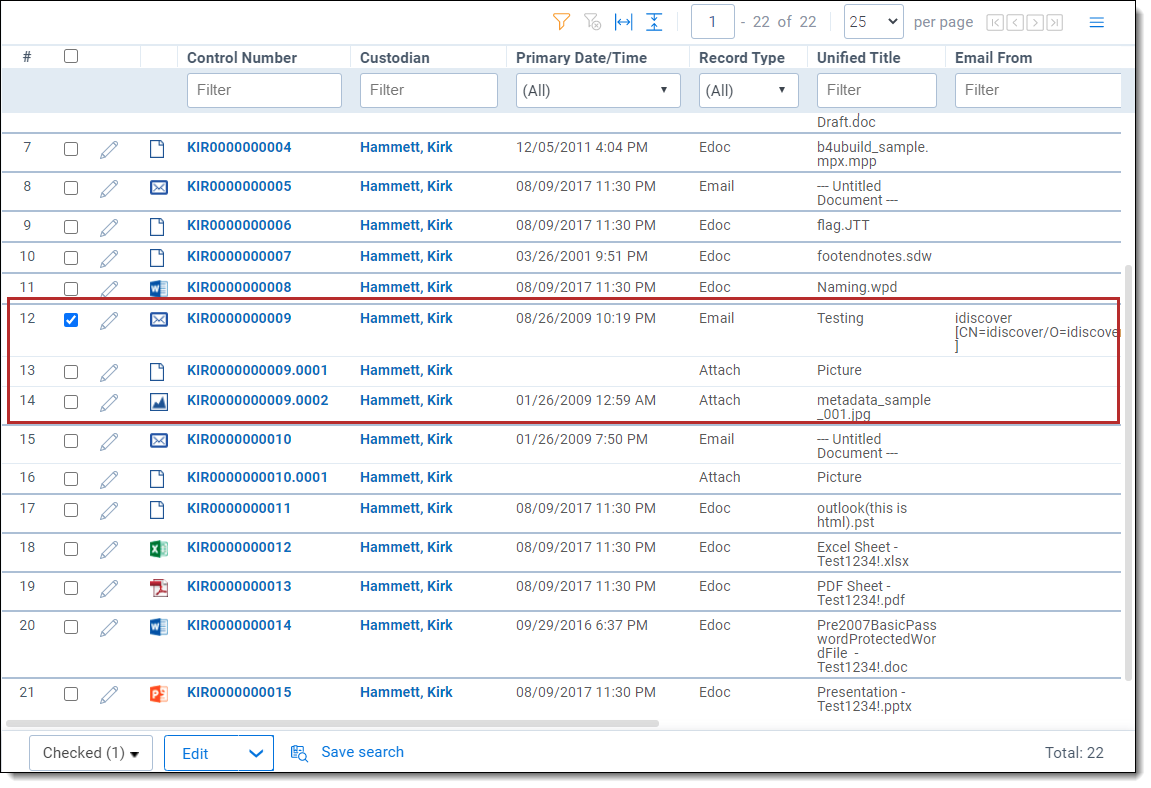 - To confirm that deduplication has been recalculated and a new master identified, locate the document you deleted and note that the following values are displayed: