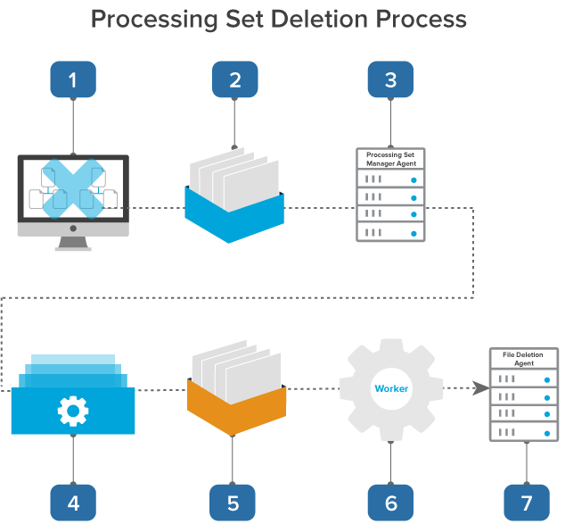 1. A worker deletes the SQL data associated with the processing set and queues up any corresponding files to be deleted by the File Deletion agent.