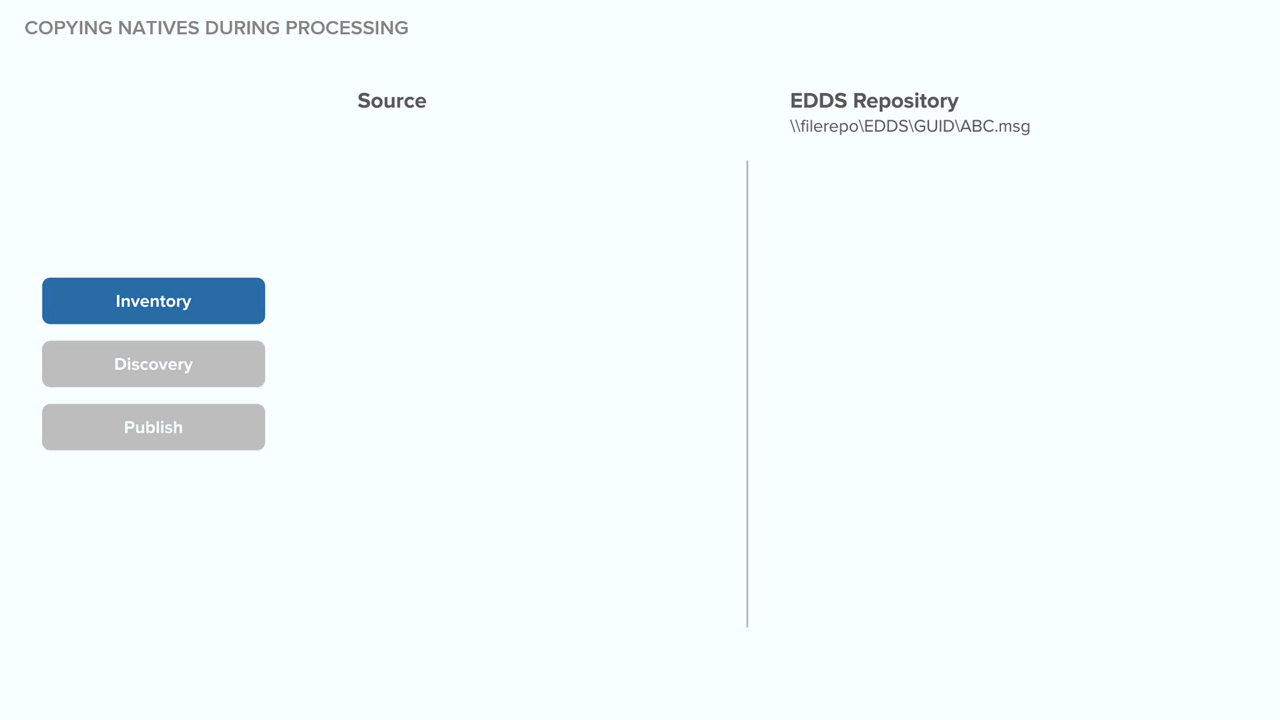 The following graphic depicts what happens behind the scenes when the system copies native files to the repository during processing. Specifically, this shows you how the system handles the data source and EDDS repository across all phases of processing when that data source isn't considered permanent.