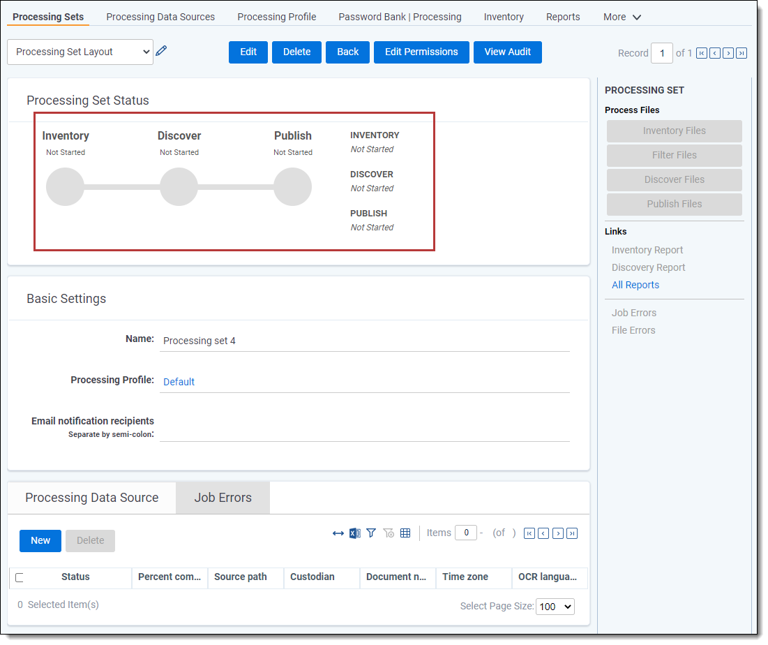 A processing set is an object to which you attach a processing profile and at least one data source and then use as the basis for a processing job. When you run a processing job, the processing engine refers to the settings specified on the data sources attached to the processing set when bringing data into Relativity.