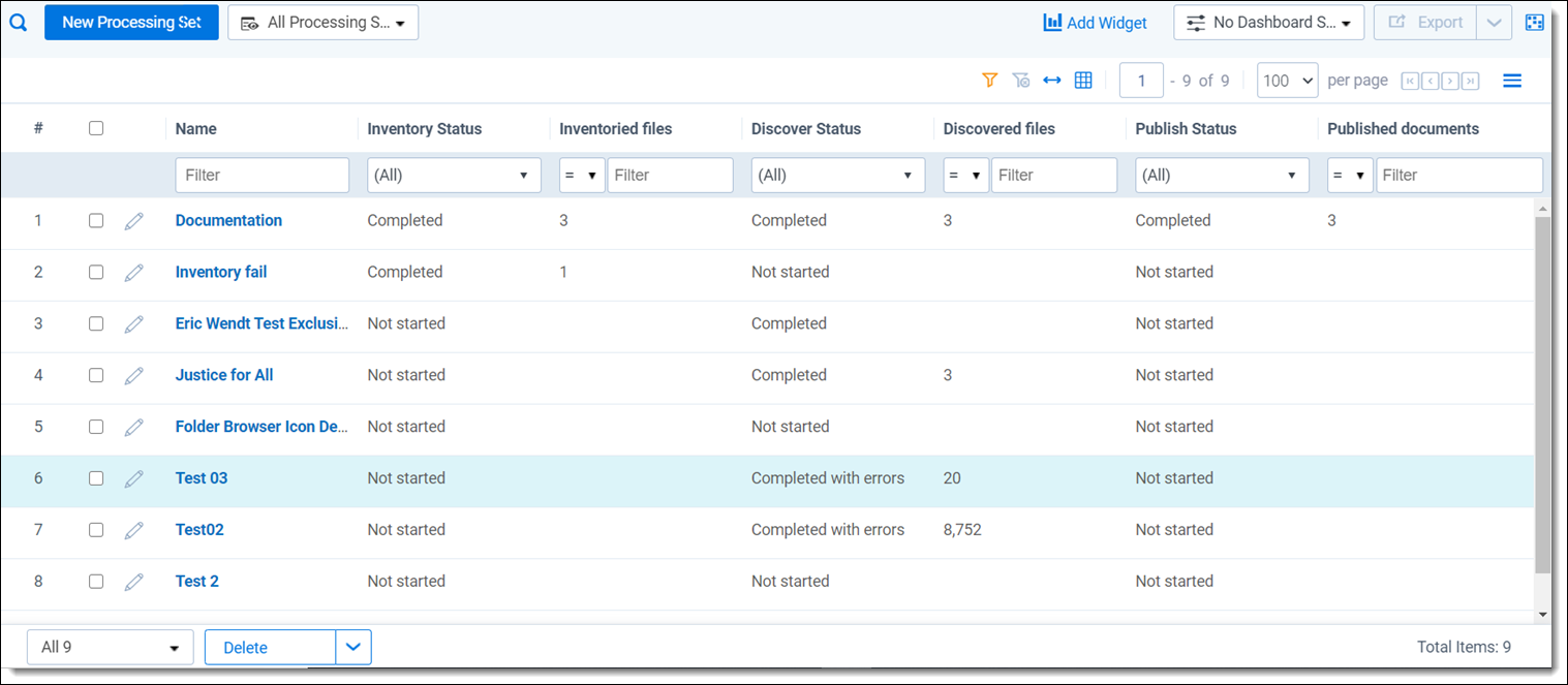 Use the Processing Sets sub-tab to see a list of all the processing sets in your environment.