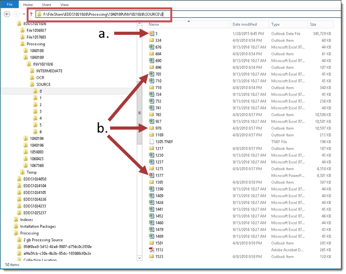 1. The EDDS12345\Processing\ProcessingSetArtifactID\INV12345\Source\0 folder displays as the original PST.
