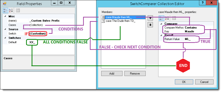 - You can have as many conditions as you want in your switch statement but remember that they are checked in order and the switch statement terminates on the first true condition. Because of this you must make certain that your logic for the conditions accurately covers all possibilities. Let’s say we have two custodians named John Smith and Sara Smith. Our first condition checks if the custodian name contained Smith then returns JS_ and the second condition looks for Sara and returns SS_. In this case, none of Sara’s documents would get a return value of SS_ because they all met condition 1 first, returned JS_, and the switch statement ended looking at no further logic.