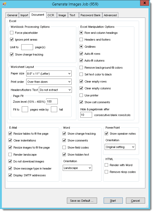 Use this option to override any pre-defined print areas existing in an Excel file. When this option is selected, the entire document is imaged.