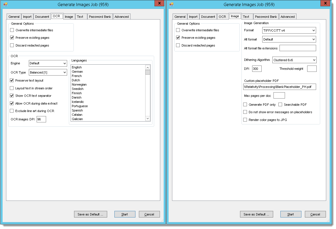 The RPC references the options set on the Document and OCR/Image tab to determine how the images are generated, and OCR runs. During OCR, the RPC converts the native files to intermediate PDFs, and the text is then extracted from these files. For intermediates derived from natives with text, the text layer of the created PDF is extracted. For intermediates derived from images the text is created by the OCR engine. Natives with both text and images will have both of these methods performed on the intermediate file.