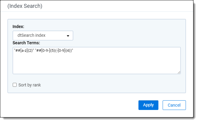 Regular Expression—"##RegularExpression". "##" signals to Relativity that the string following ##, and encapsulated by double quotes, should be interpreted as regular expression. Be sure to use straight double quotes ("") and not curly quotes (“”). Curly quotes may cause the regular expression to fail . You also want to avoid using capital letters in your regular expression because all characters in a dtSearch index are normalized to lowercase. You can use the Dictionary to help troubleshoot an individual regular expression. If your expression does not match in the Dictionary, it will not match in the index.