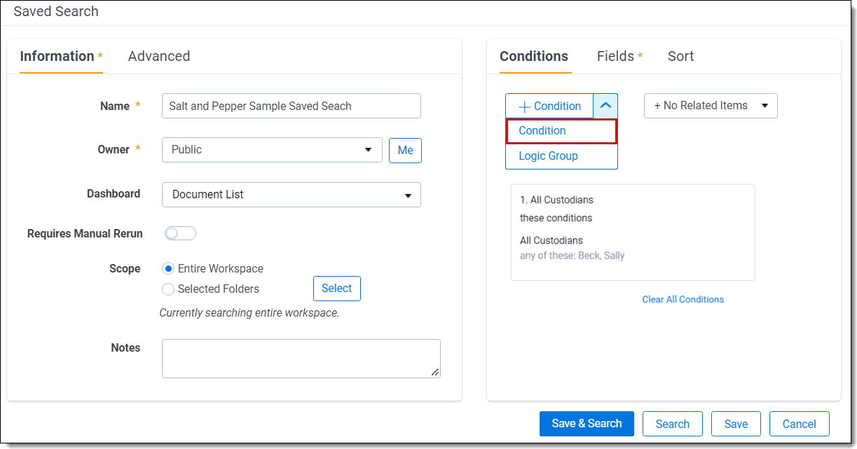 4. Click Add Condition to add a new condition to the search or click Add Logic Group to create a logic group to group conditions together to create the criteria for the search. In the image below, a condition is set where the custodian is Sally Beck. For more information on setting conditions, see Conditions.