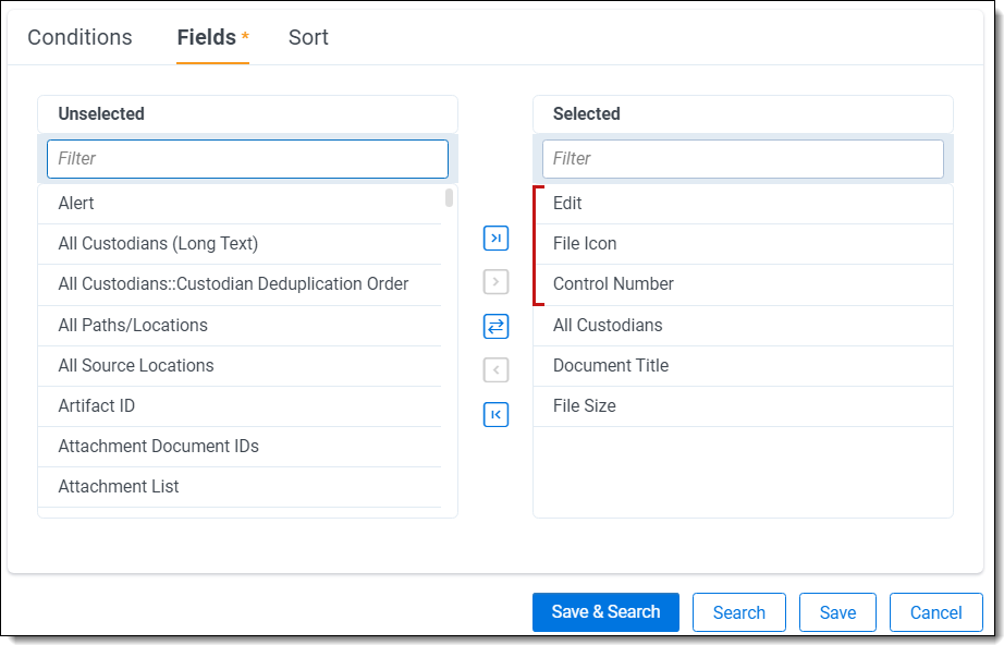 6. Click the Fields tab. Select the fields you want to display in the search results. Note that Edit, File Icon, and Control Number are default fields and are preselected. You can remove them if they are not needed. For more information on setting search results fields, see Search fields.