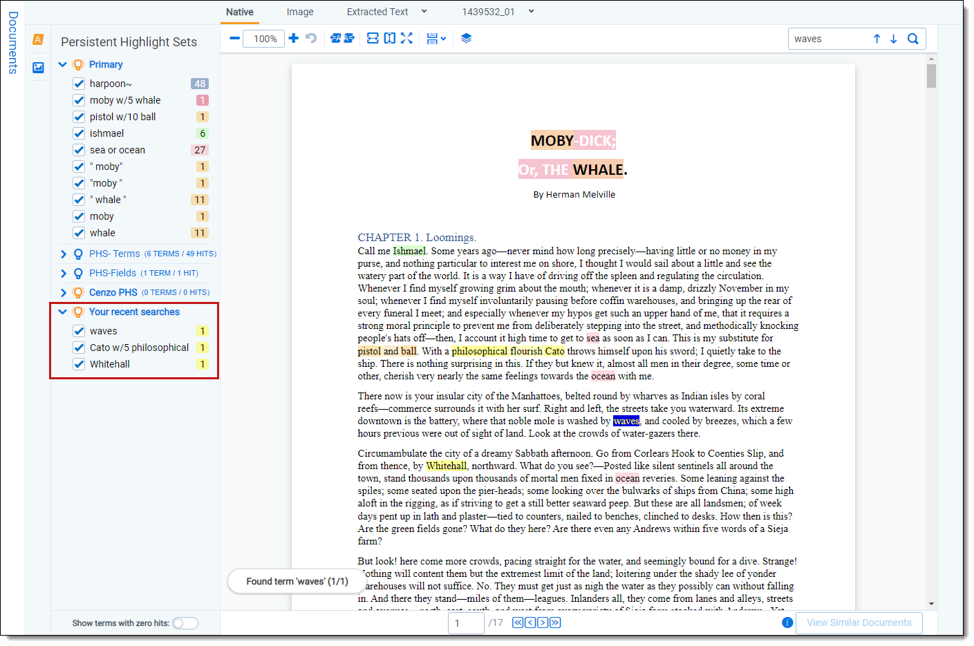 4. Click on the desired document to open it in the Viewer. Terms that match the entered criteria are highlighted as Recent Searches along with any Persistent Highlight Sets that are enabled.