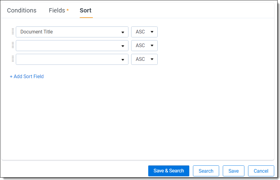 7. Click the Sort tab to specify sorting for the search results. For more information on setting the sort order, see Sort.