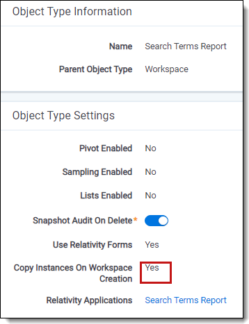 1. From your active workspace, ensure that the Search Terms Report object type setting for Copy Instances On Workspace Creation is enabled.