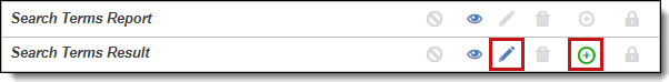 3. Scroll down to locate the two entries for search terms reports--Search Terms Report and Search Terms Result. You want to edit permissions for existing terms, so you will edit the Search Terms Result object. The Search Terms Report object grants permissions for reports overall and not the content within the report. Click one or more icons to enable the permission level. Available levels include Disable, View, Edit, Delete, Add, or Manage Security.