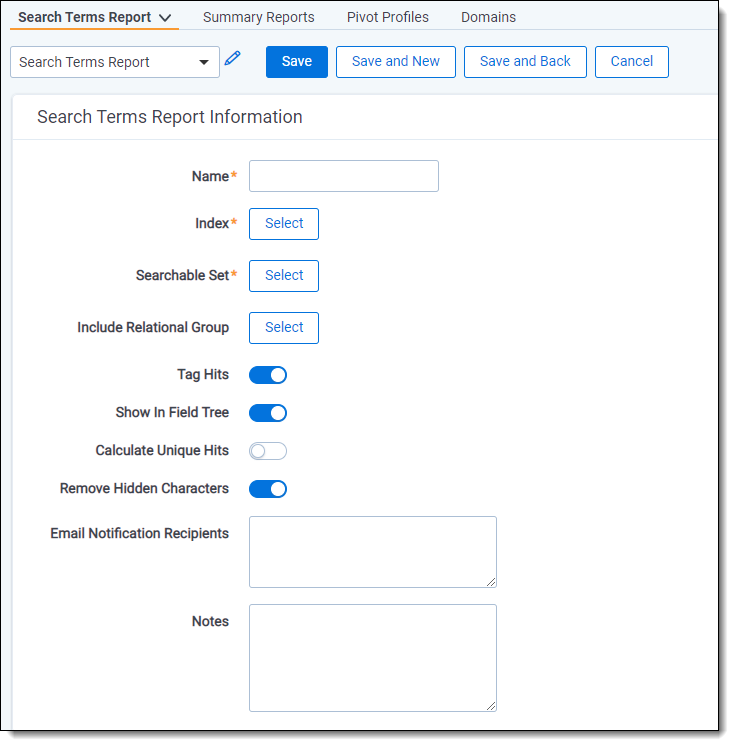 • Select the Tag Hits toggle to create a multiple object field for the search terms report. If this field is not created you cannot select it in the Highlight Fields option when creating a persistent highlights set. See Persistent highlight sets.