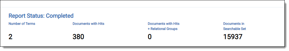 • Run All Terms—generates counts for each term. Use this option when generating the report for the first time or if you want to regenerate counts for all terms in the report. Run all terms after adding new documents to the searchable set.