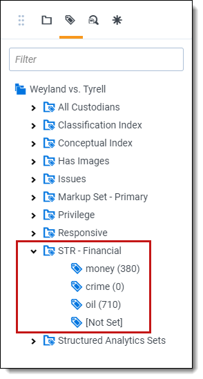 After you run a search terms report with the Tag option enabled, Relativity creates a folder in the Field Tree browser with documents grouped by tags found by the search terms report. Each tag includes the count of documents containing that term. The folder is named after the search terms reports multiple object field created by the search terms report. For example, if your search terms report is named Produced Documents, the folder in the Field Tree browser is named STR - Produced Documents.