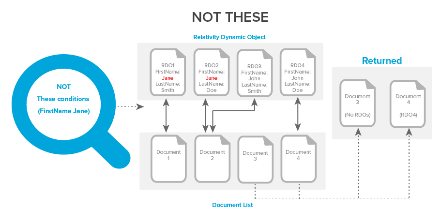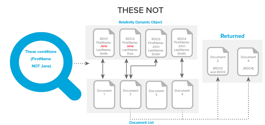 - NOT These Conditions - returns all documents that are not associated with at least one RDO that meets the criteria.