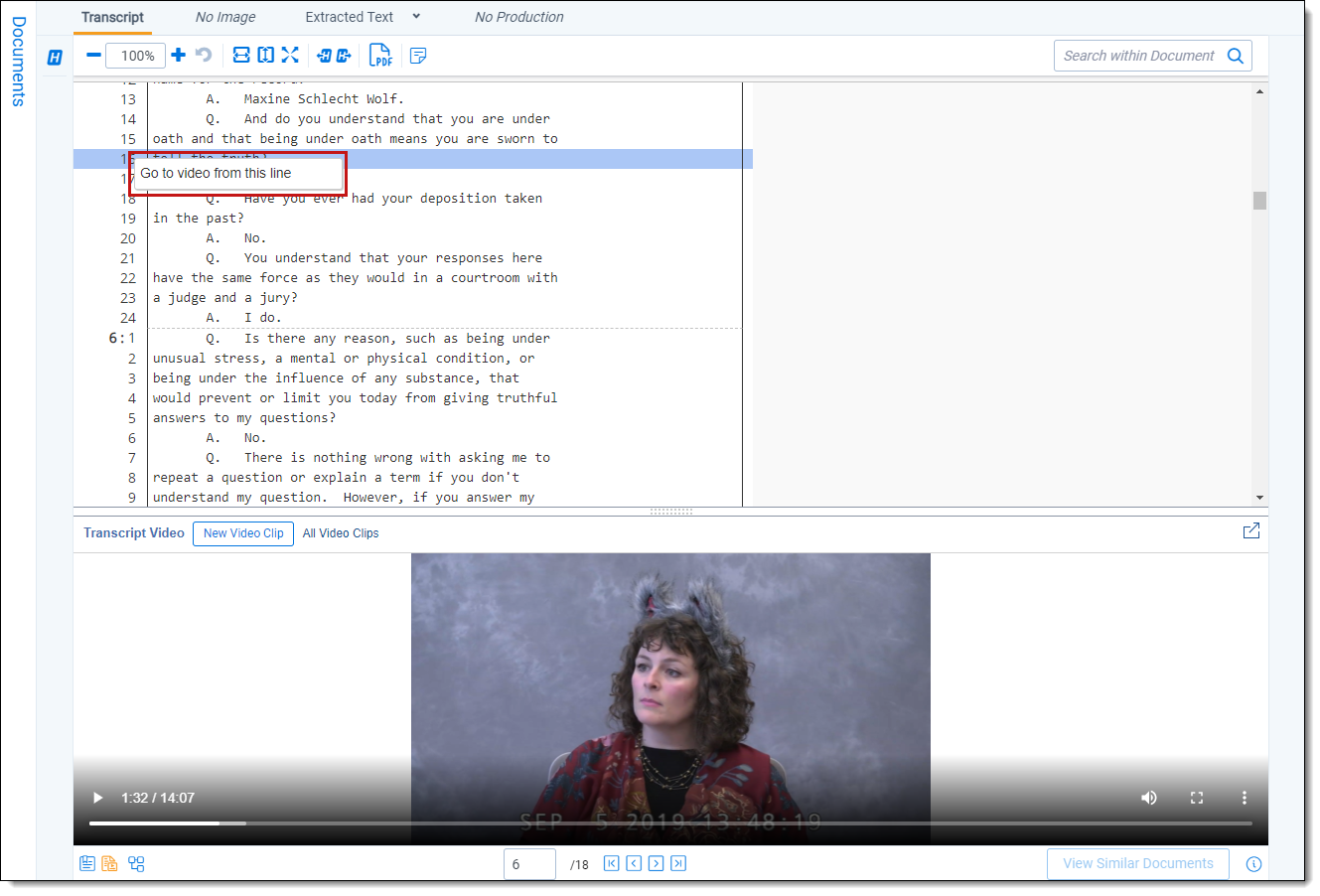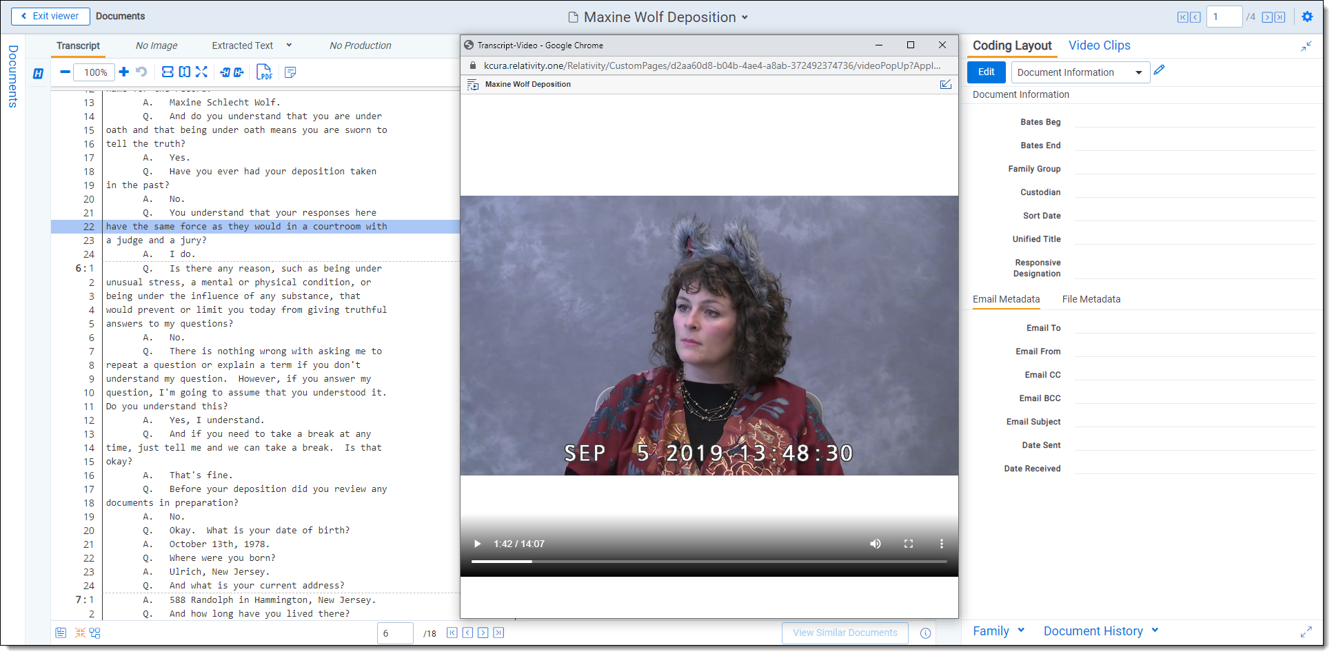 Transcripts load files often come with a video of the interview. The video can be played in the Viewer in sync with the text of the transcript. To learn more, see Supported file types for the Transcripts application.