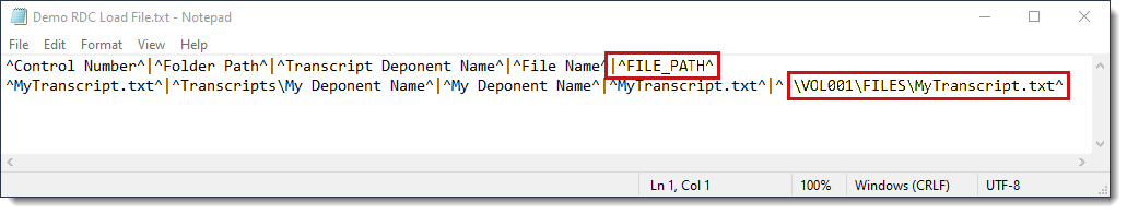 You can use a relative or absolute path when importing transcripts using the RDC. An example of a load file is provided below.