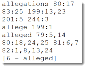 • The Transcripts application does not support Transcript files that contain a word index before they are uploaded to Relativity. For example, the .txt transcript file below is not supported because it contains a word index.