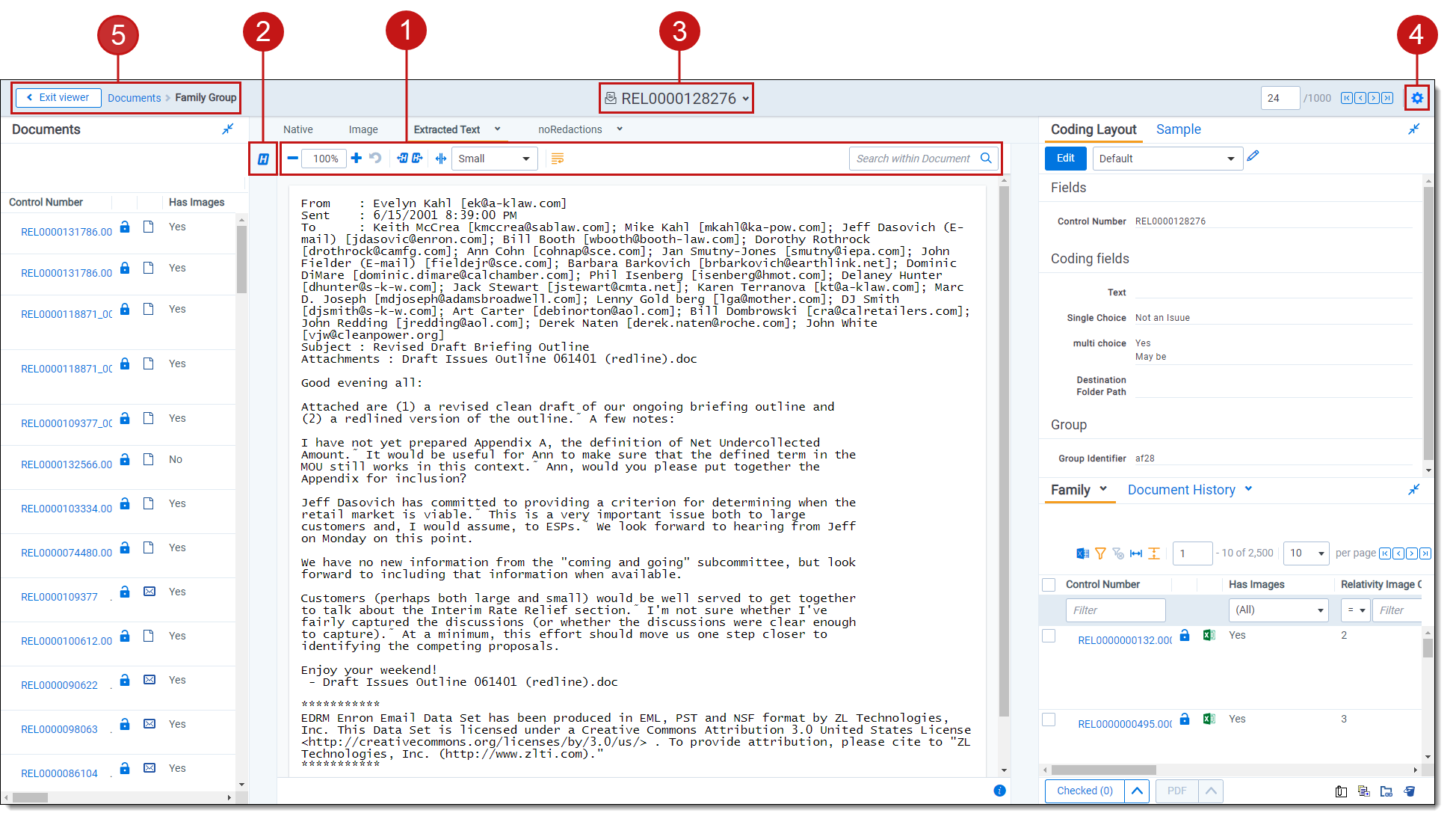 The Documents card contains the document list so you can conveniently navigate from document-to-document without having to leave the Viewer. The fields that display in the card are based on which view is selected in the document list. Each time that you save a coding decision in the Viewer, the Documents card refreshes to show the latest results. The highlighted document in the document list now updates when you navigate from document-to-document to make tracking even easier.