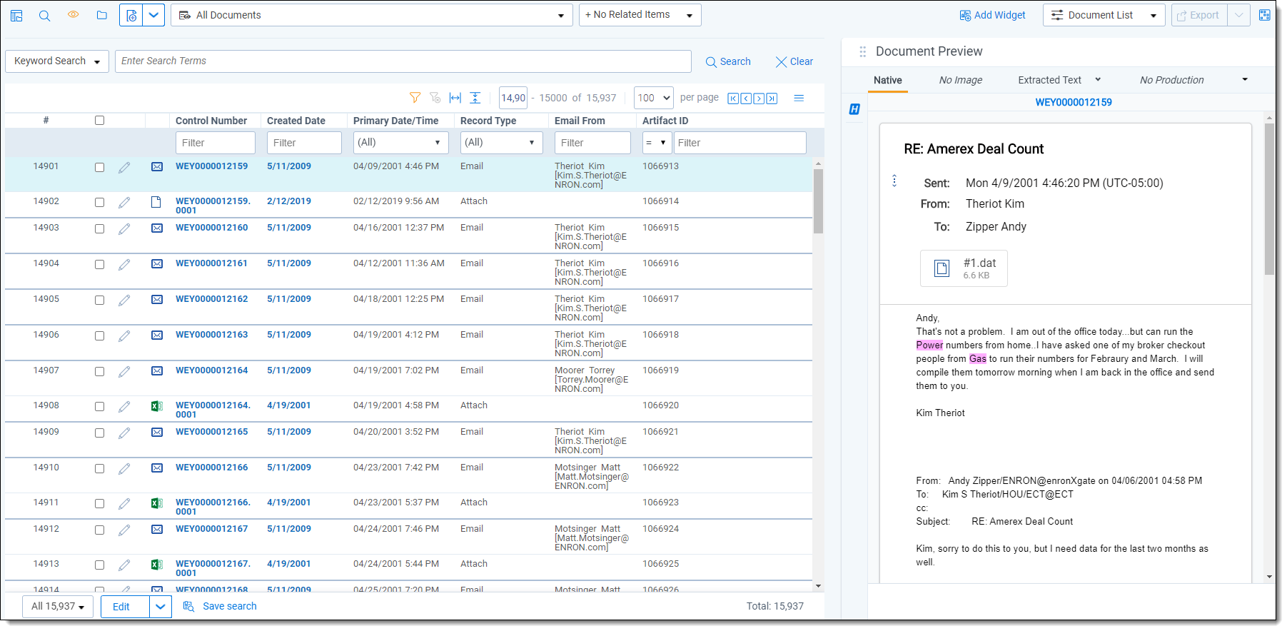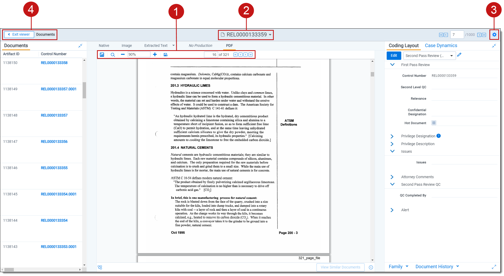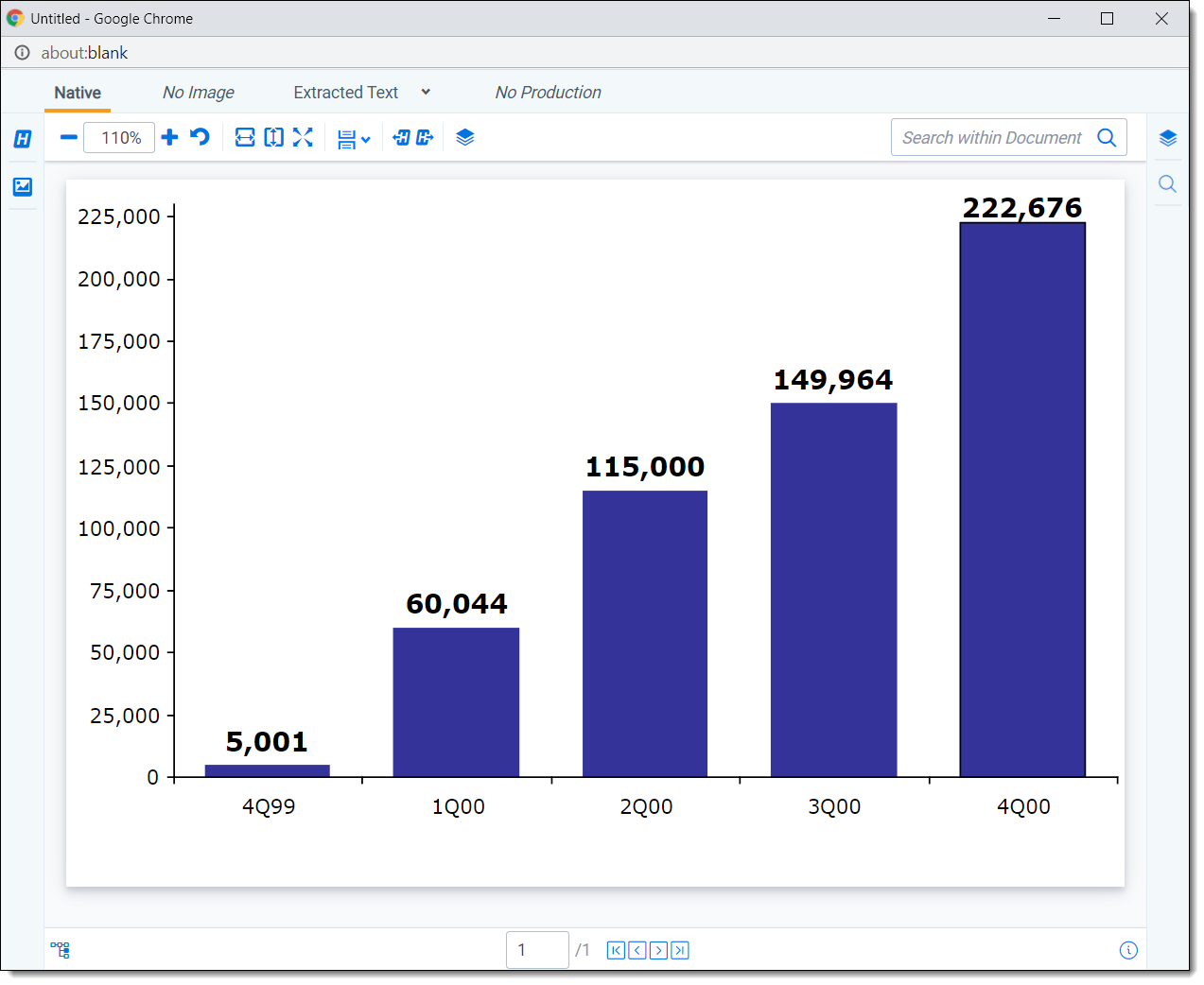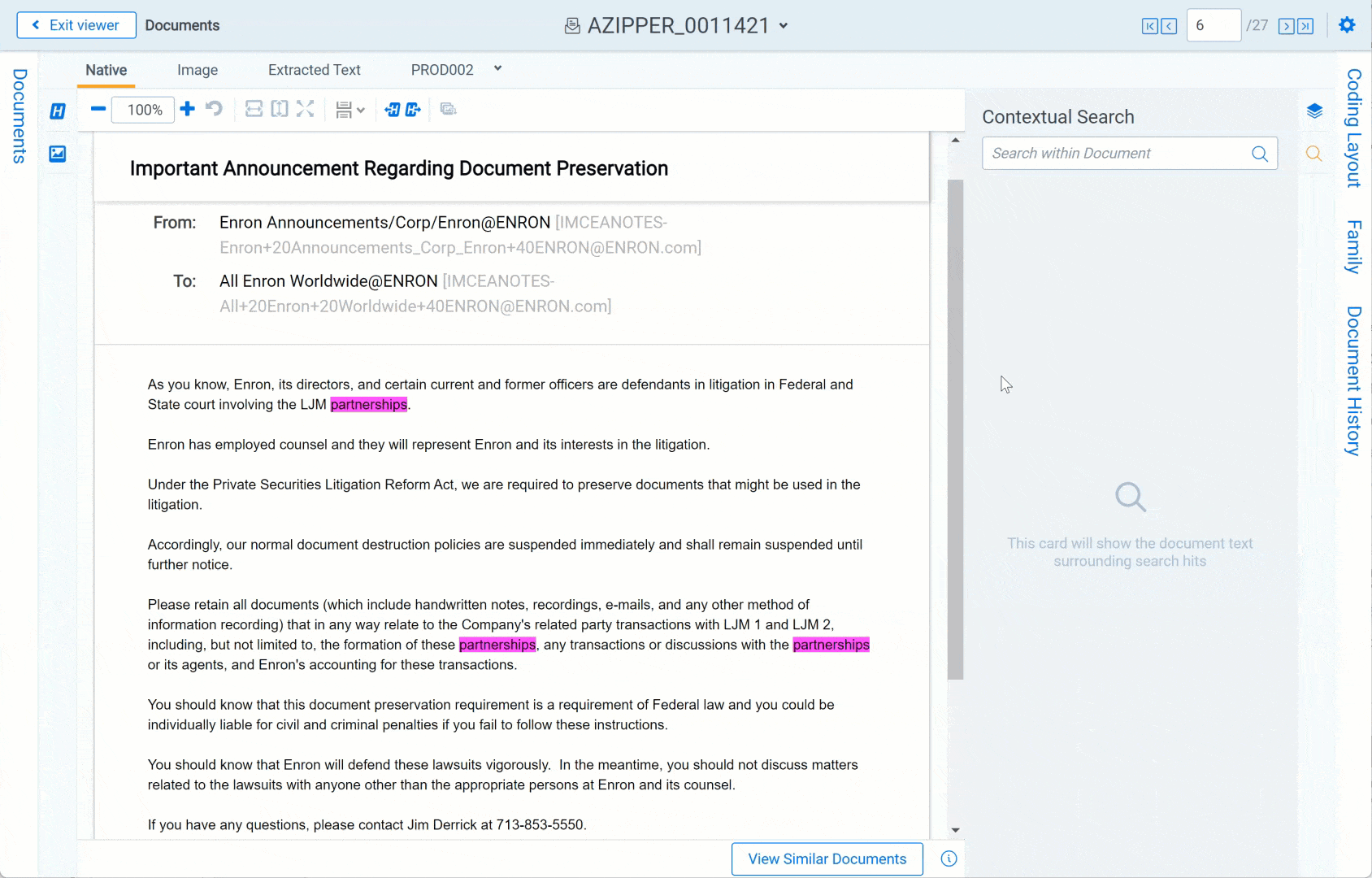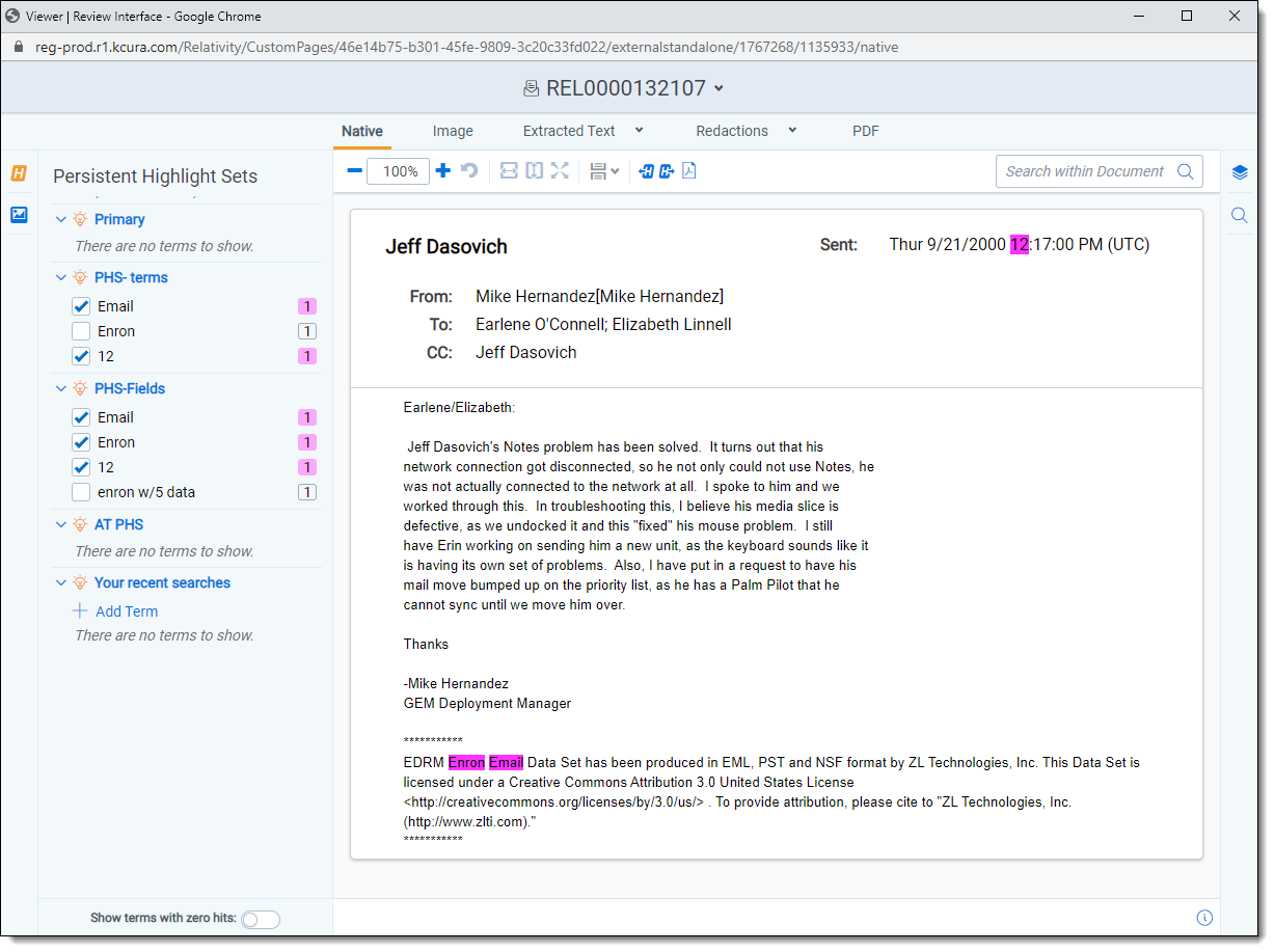 The Native Viewer displays an HTML rendering of the document that is as close to the original version of the document as possible. It also provides options for navigating through a single document and between documents in a document set. You can also conduct text searching, highlighting text to copy and paste, zooming, arranging, and saving pages you review in the Native Viewer. You also have the option to print single documents from the Native Viewer by saving the document as a PDF. For more information, see Create PDF.