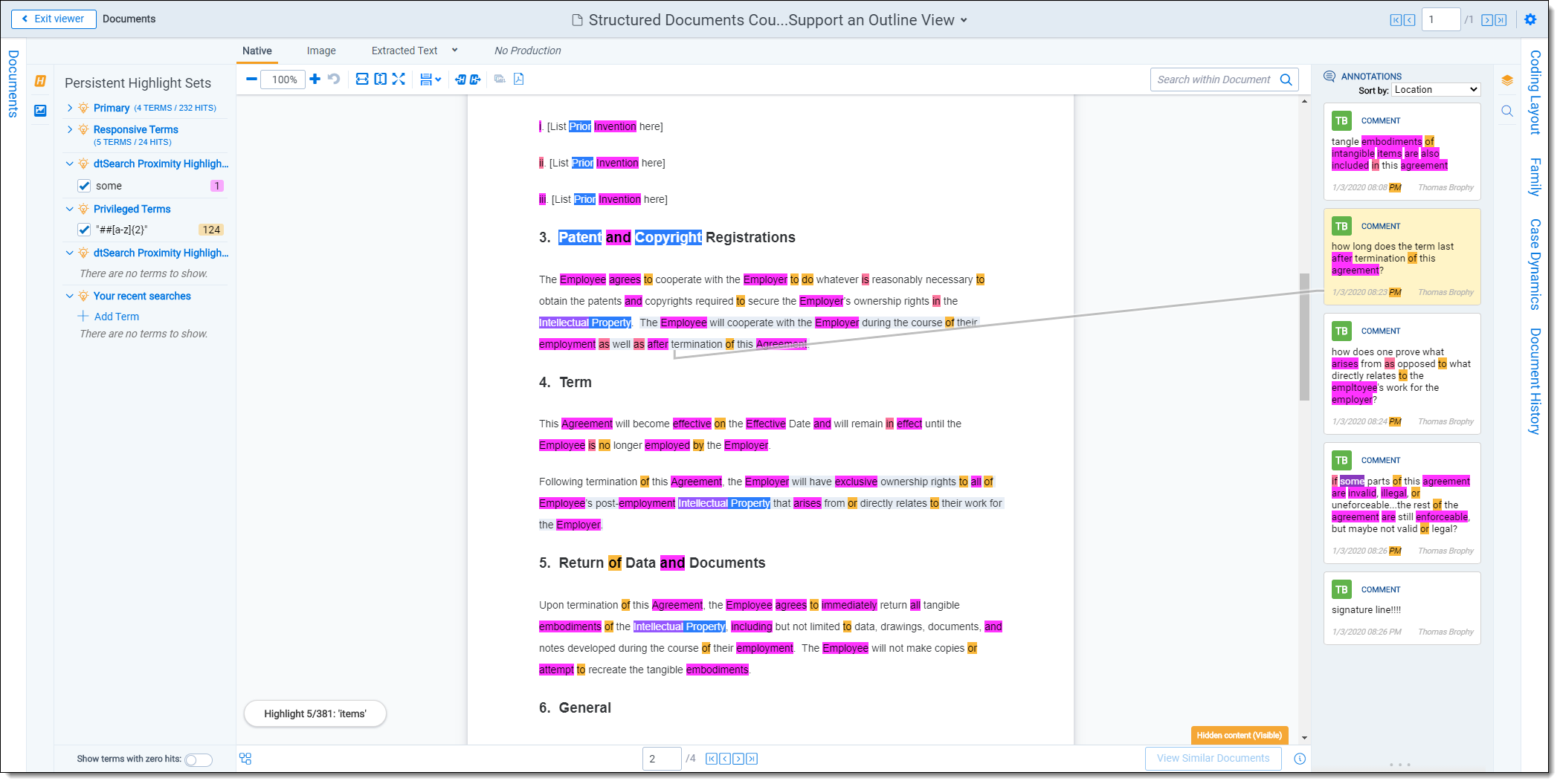 To view highlights associated with hidden content, such as comments or annotations listed below, the corresponding content must be visible in the Viewer. This is because hidden content is embedded directly within the document and is not stored as metadata or extracted text.