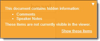 • Show/Hide Hidden Content —displays or hides information about hidden content. Hidden content can appear in Excel, Word, PDF, or Powerpoint documents. This functionality does not work on imaged documents because Relativity only images unhidden cells. To learn more, see Tracking annotations.