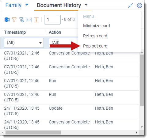 The Document History card can be opened in a separate browser window. Click the Menu icon and select Pop out card to open the card in its own window. Click the Menu icon and select Pop in card to close the browser window and return the card to the Viewer.