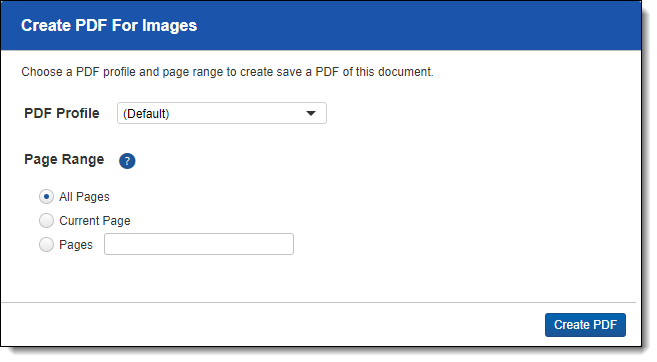 • Create PDF —click to save the current native document as a PDF file. When you click this option, the Create PDF pop-up displays. The document then opens in a new window in your browser as a PDF where you can then choose to save or print the document image. This option is only available if the PDF application is installed in your workspace. To learn more, see Mass PDF.