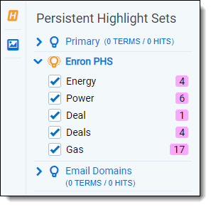 Additionally, you can control which highlights display in the current document by clicking on either the persistent set to only display highlights from that set or you can click on a specific term to only see that term highlighted in the document. You can also navigate to and from highlights using this pane.