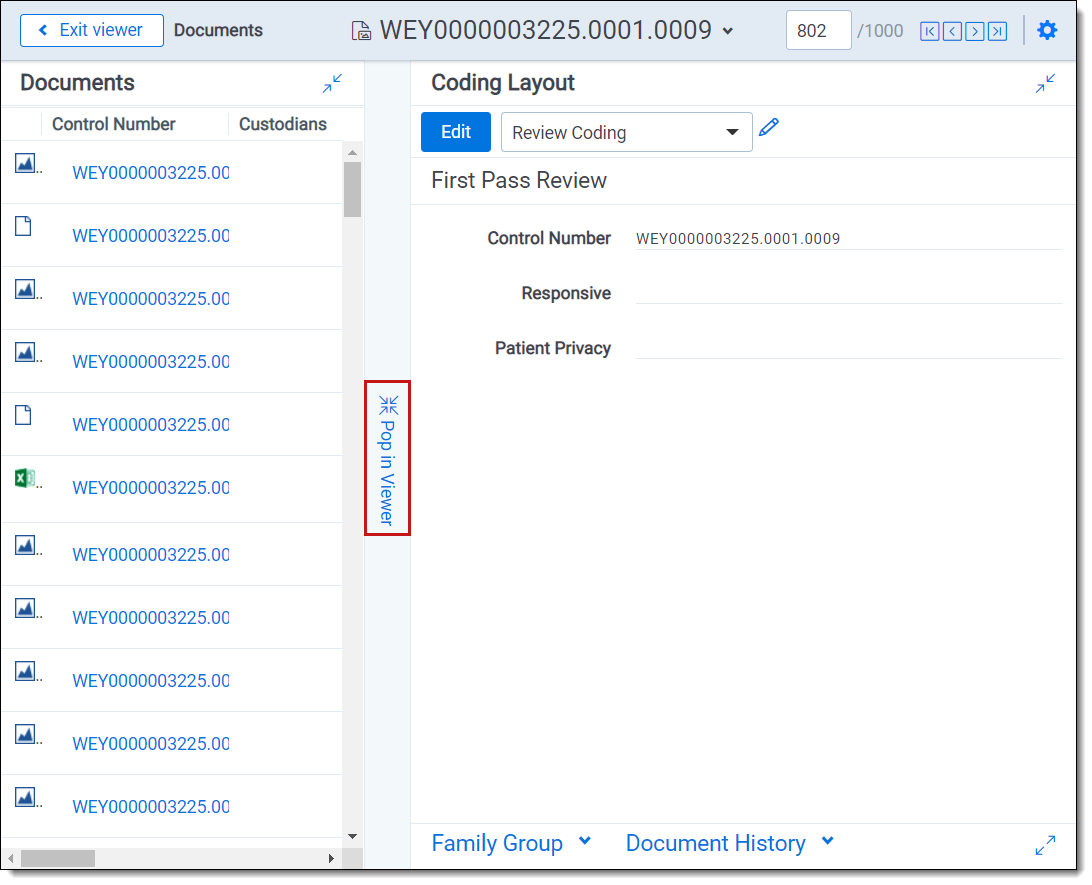 You can use the Pop Out Viewer to open the Viewer in a new window in your browser. The document card and the coding card remain in the previously opened browser window and can be expanded to a greater width to take advantage of the space freed up by the Pop Out Viewer. The Pop Out Viewer retains the same functionality as the Viewer. For example, you can switch Viewer types and view highlights or the Thumbnail Viewer as desired.