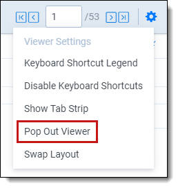 To return the Viewer to the previous browser window where the document card and coding card are located, you can click either the Pop In Viewer button on the previous browser window or you can select the Pop In Viewer option from the Viewer settings menu in the upper-right.