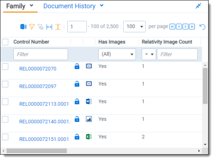 • Related items —displays a group of documents related to the active document. Options vary within the workspace. Hover over each icon to display the name of the item. Examples include: family group, duplicates, and thread group.
