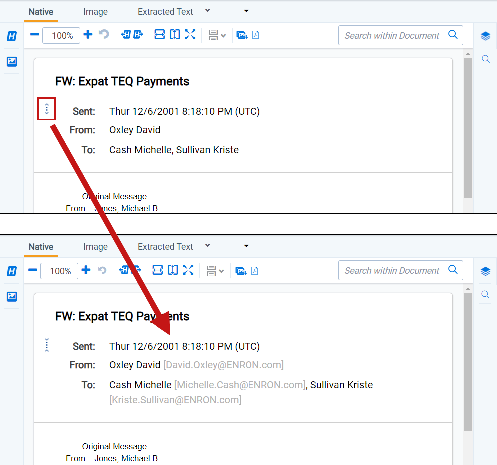 In the Native Viewer, you can expand the email header to display full email addresses. If you collapse or expand an email header, the Viewer maintains the expanded or collapsed state as you navigate through documents in the set.