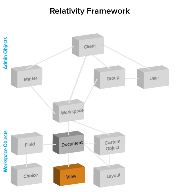 Views are customizable lists of items in Relativity. This diagram illustrates the relationship between views and other Relativity objects.