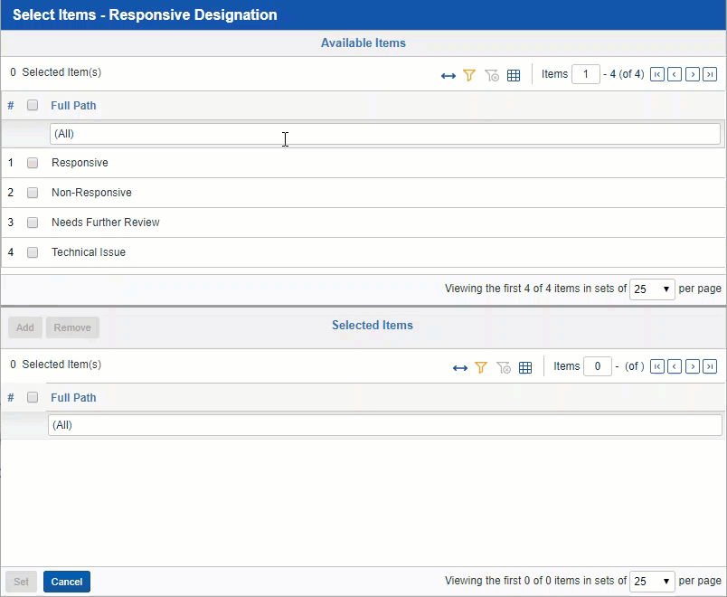 Likewise, check any item in the Selected Items list and click Remove to place the item back into the Available Items list. Click Set to removes the item from the view condition.