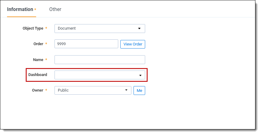 2. Choose an Object Type from the drop-down menu that is compatible with dashboards.